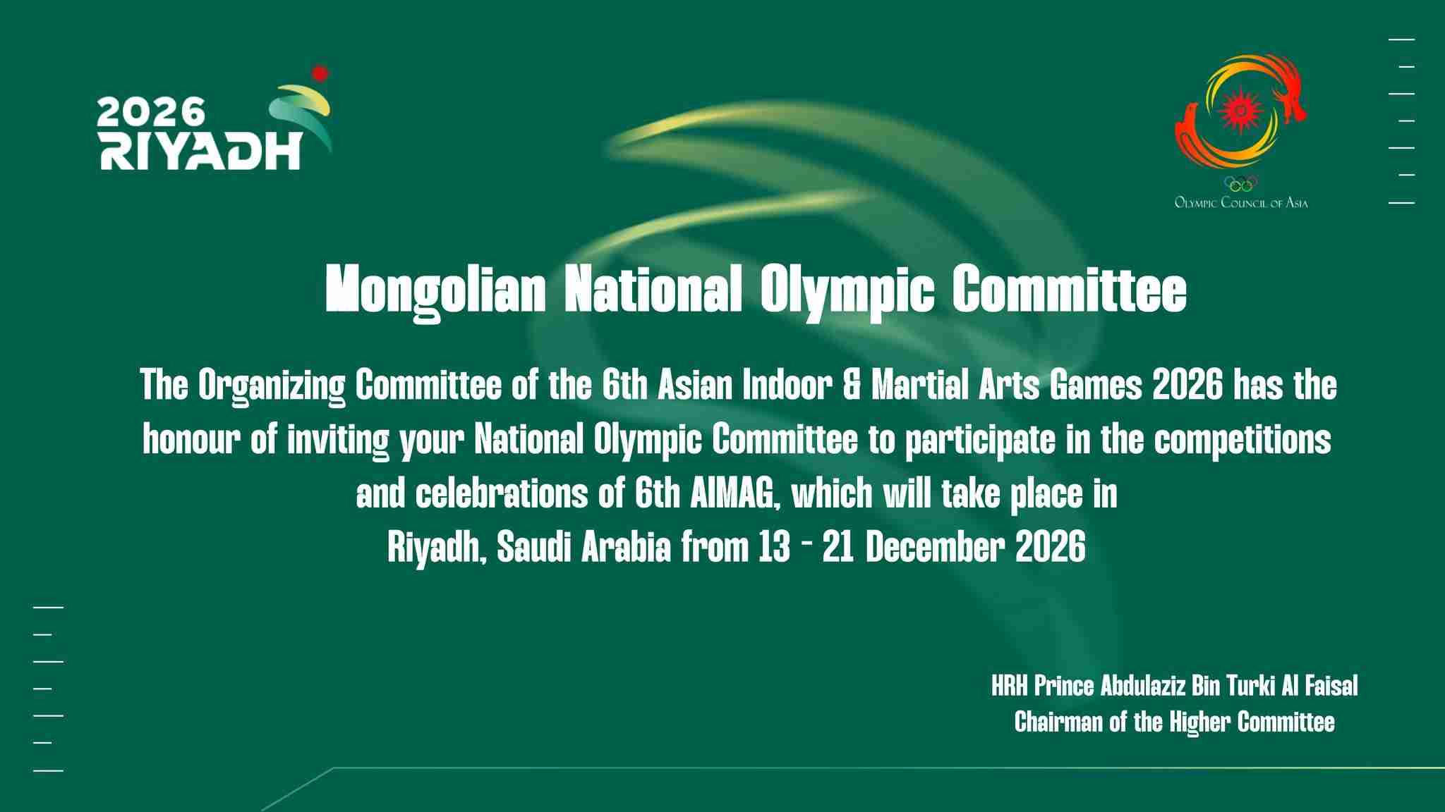 2 өдрийн өмнө 8Азийн олимпын зөвлөл /АОЗ/ болон “Рияд 2026” Зохион байгуулах хороо /ЗБХ -AIMAG /-ноос ирэх 2026 оны 12 дугаар сарын 13–21-ний өдрүүдэд зохион байгуулагдах “Азийн танхимын болон тулааны спортын VI наадам”-ын урилгыг МҮОХ-нд албан ёсоор ирүүллээ.