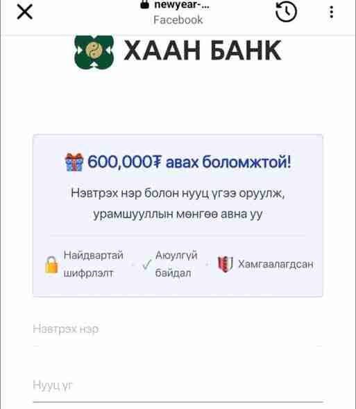 22 цагийн өмнө 1Сүүлийн үед олон нийтийн цахим сүлжээ тэр дундаа фэйсбүүк чатаар дамжуулан нэр бүхий банкны логотой хаягаар “Та мөнгө хожлоо банкны нууц үгээ оруулж мөнгөө аваарай” гэх хуурамч мэдээлэл тархаж иргэд мөнгөө алдах тохиолдол нэмэгдэж байна.