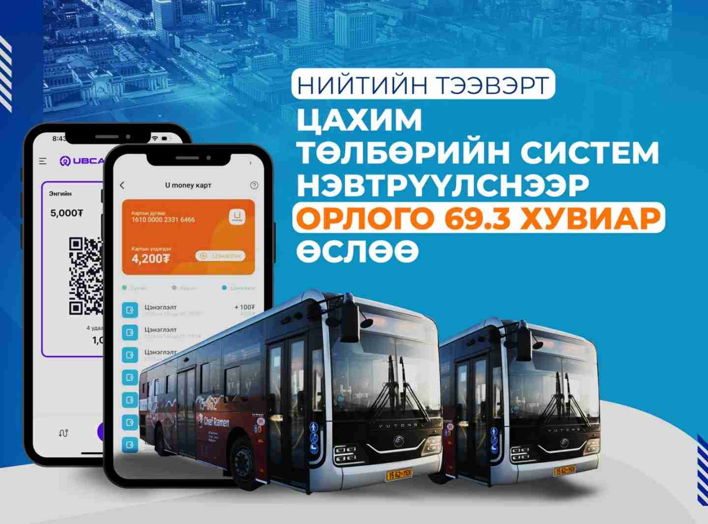 Нийслэлийн нийтийн тээвэрт зөвхөн Улаанбаатар смарт картаар зорчдог байсан бол 2025 онд цахим төлбөрийн систем нэвтрүүлж, Улаанбаатар смарт карт, банкны карт, гар утасны аппликейшн, QR код, бэлэн мөнгө зэрэг сонголтоор төлбөр төлж, нийтийн тээврээр үйлчлүүлж байна.