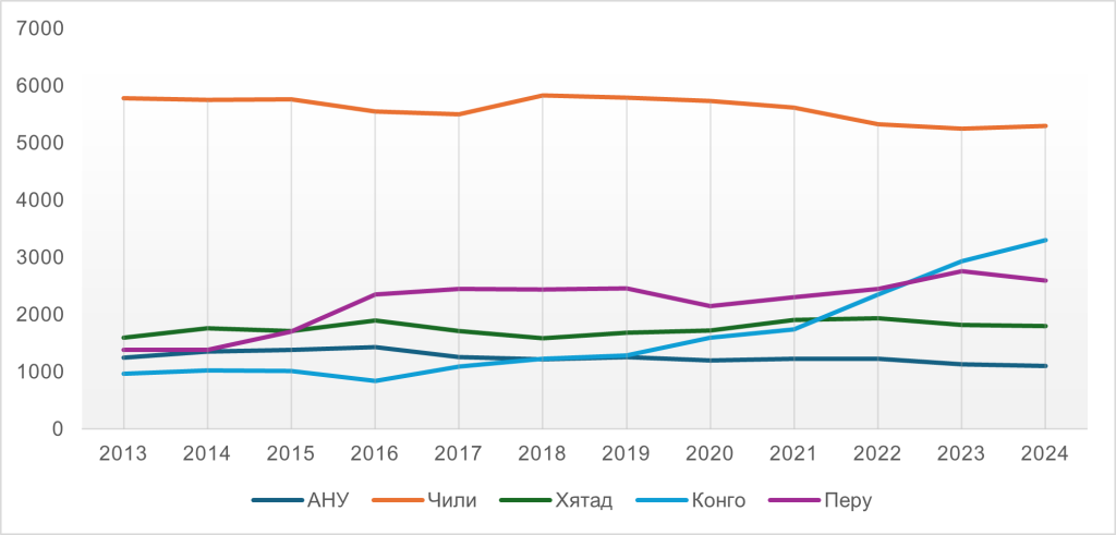 Зураг 2. Зэсийн баяжмалын олборлолт, тэргүүлэх улсуудаар 2013-2024