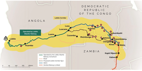 Зураг-1. Лобито дэд бүтцийн корридорын зураглал. Тус корридорын хүрээнд баригдах дэд бүтэц, төмөр замын ойр байрших чухал минералын орд газруудын нэр, байршил, эзэмшил. (APRI институт)