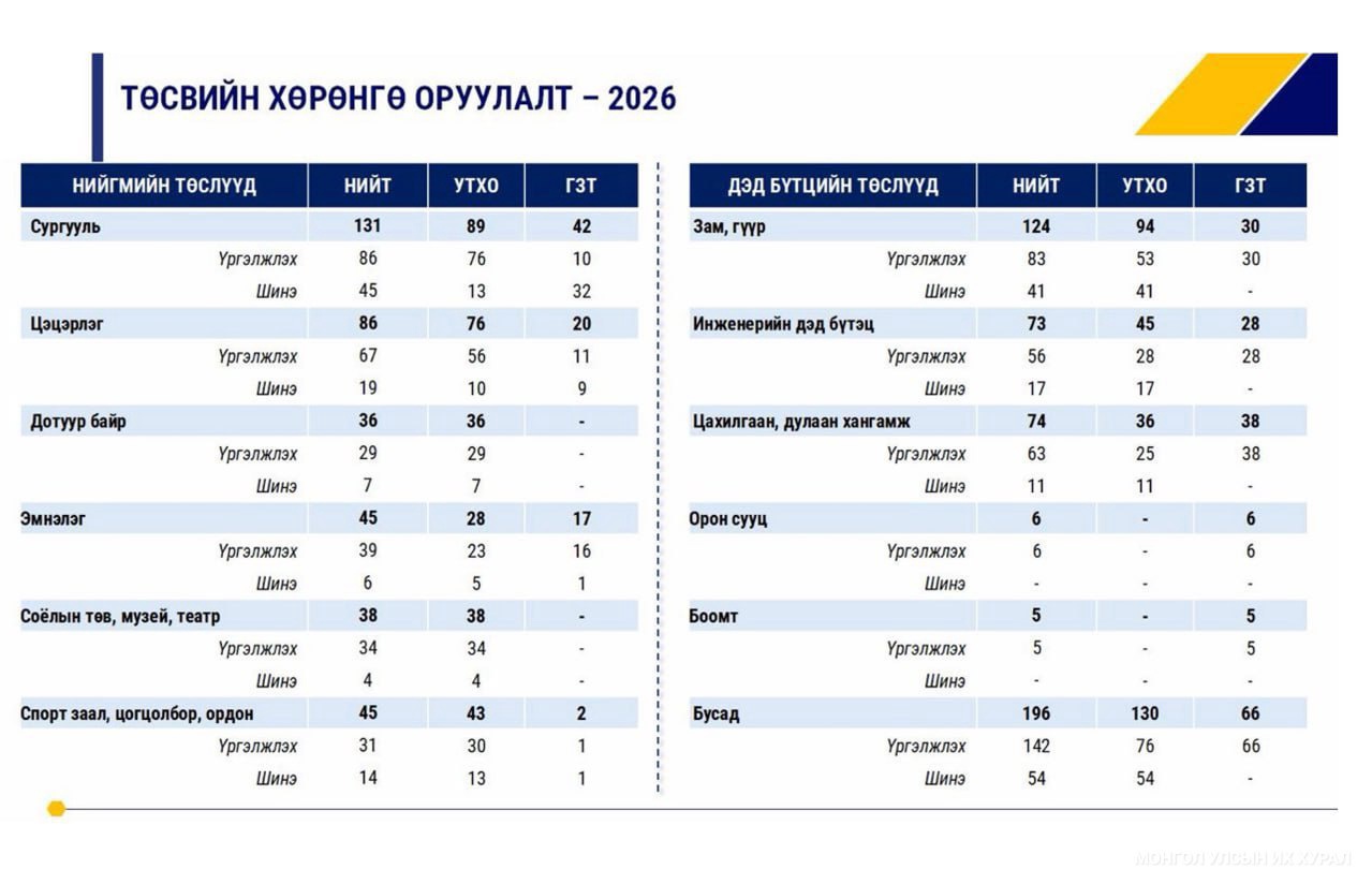 2026 оны төсвийн жилд улсын төсвийн хөрөнгөөр 11.1 их наяд төгрөгийн төсөвт өртөгтэй, нийт 738 төслийг 3.3 их наяд төгрөгөөр санхүүжүүлэхээр тусгасныг Байнгын хорооны дарга мэдээллийнхээ үеэр онцолж байлаа.