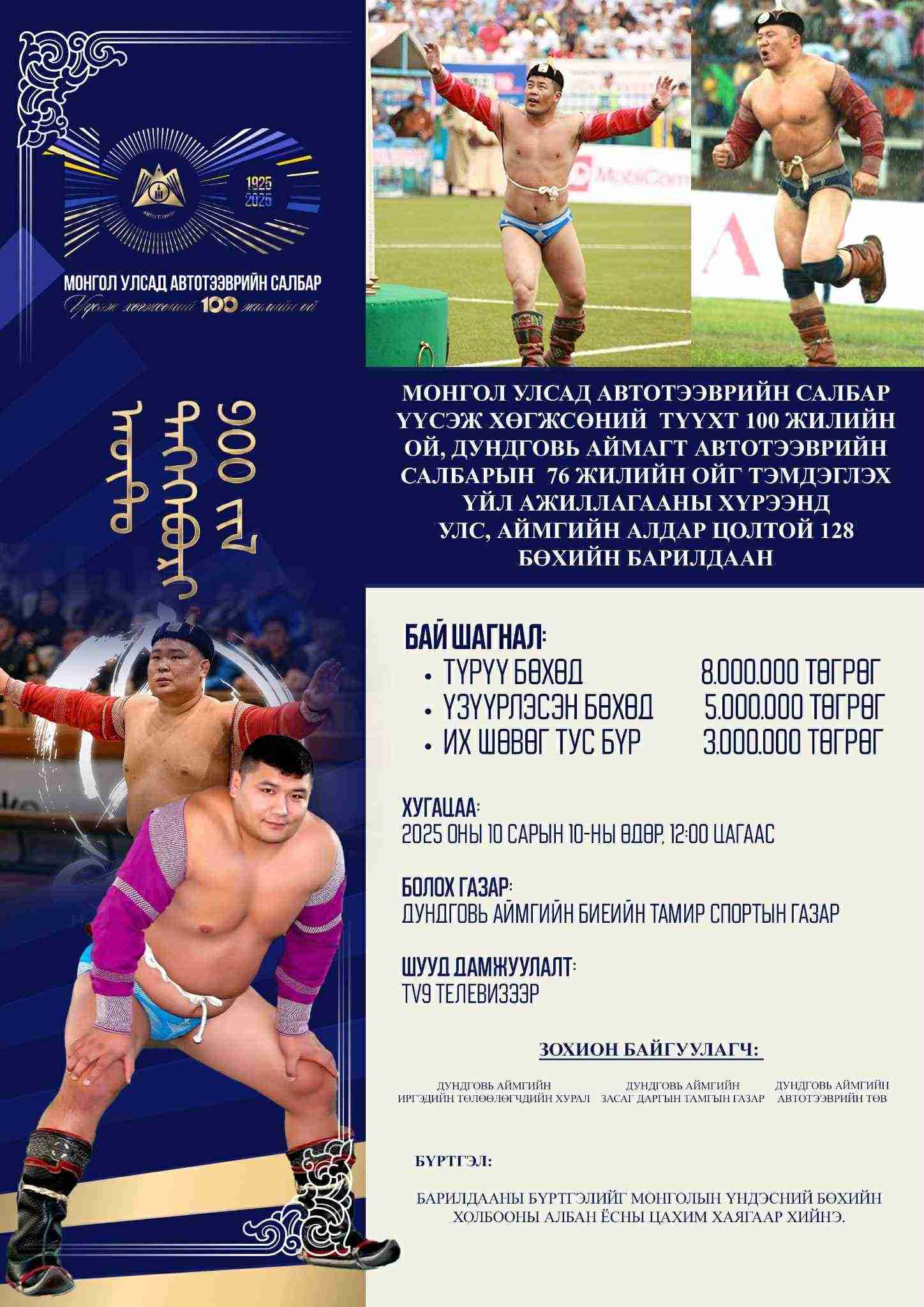 22 цагийн өмнө 2Монгол Улсад Автотээврийн салбар үүсэж хөгжсөний түүхт 100 жилийн ой, Дундговь аймагт Автотээврийн салбарын 76 жилийн ойг тэмдэглэх үйл ажиллагааны хүрээнд УЛС, АЙМГИЙН АЛДАР ЦОЛТОЙ 128 БӨХИЙН БАРИЛДААН 2025 оны 10 сарын 10-ны өдөр, 12:00 цагаас Дундговь аймгийн Биеийн тамир спортын газарт болно.