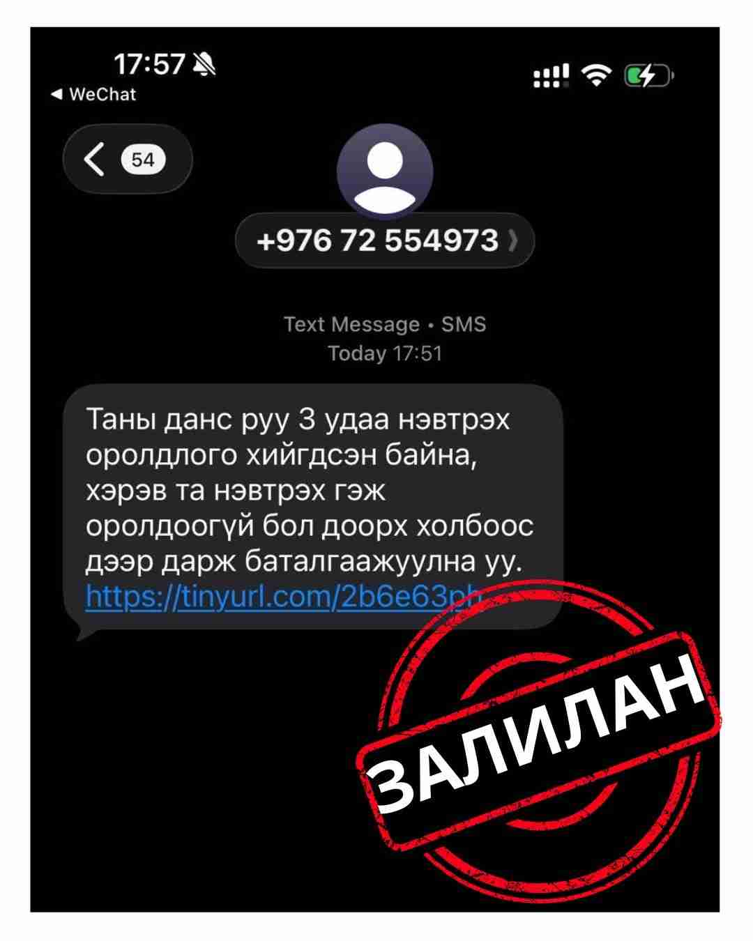 56 минутын өмнө 1Сүүлийн үед “Таны данс руу 3 удаа нэвтрэх оролдлого хийгдсэн байна, хэрэв та нэвтрэх гэж оролдоогүй бол доорх холбоос дээр дарж баталгаажуулна уу” гэх агуулгатай хуурамч /SMS/ мессеж илгээж, иргэдийг хууран мэхлэх замаар тухайн холбоос дээр даруулан интернет банкны нэвтрэх нэр, нууц үг, баталгаажуулах код зэрэг хувийн мэдээллийг нь хууль бусаар авч иргэдийг залилах гэмт хэрэг бүртгэгдэж байна.