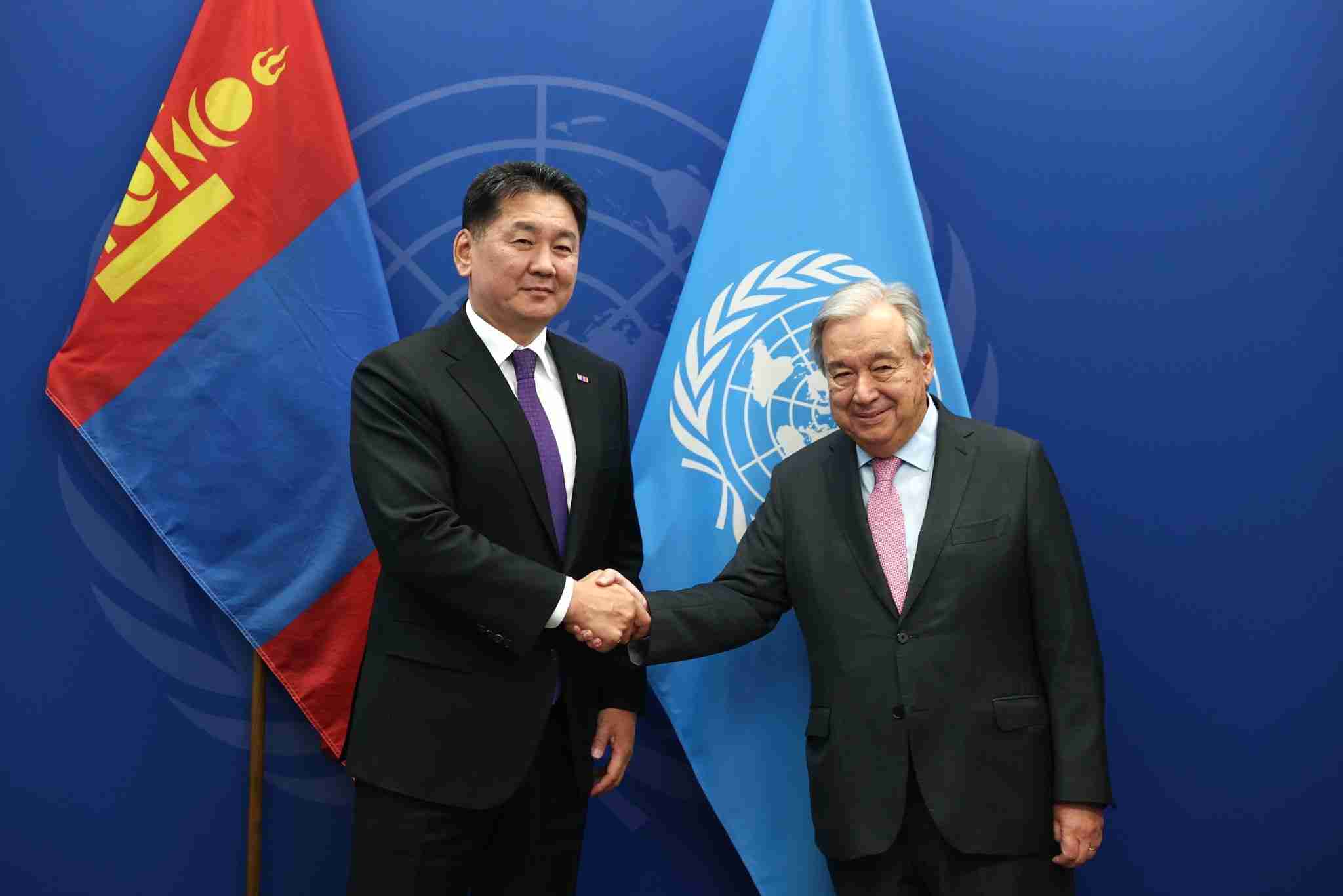 Монгол Улсын Ерөнхийлөгч Ухнаагийн Хүрэлсүх Нью-Йорк хотноо болж буй НҮБ-ын Ерөнхий Ассамблейн 79 дүгээр чуулганы Ерөнхий санал шүүмжлэлд оролцох үеэрээ НҮБ-ын Ерөнхий нарийн бичгийн дарга Антонио Гутеррештэй 2024 оны 09 дүгээр сарын 25-ны өдөр уулзлаа.