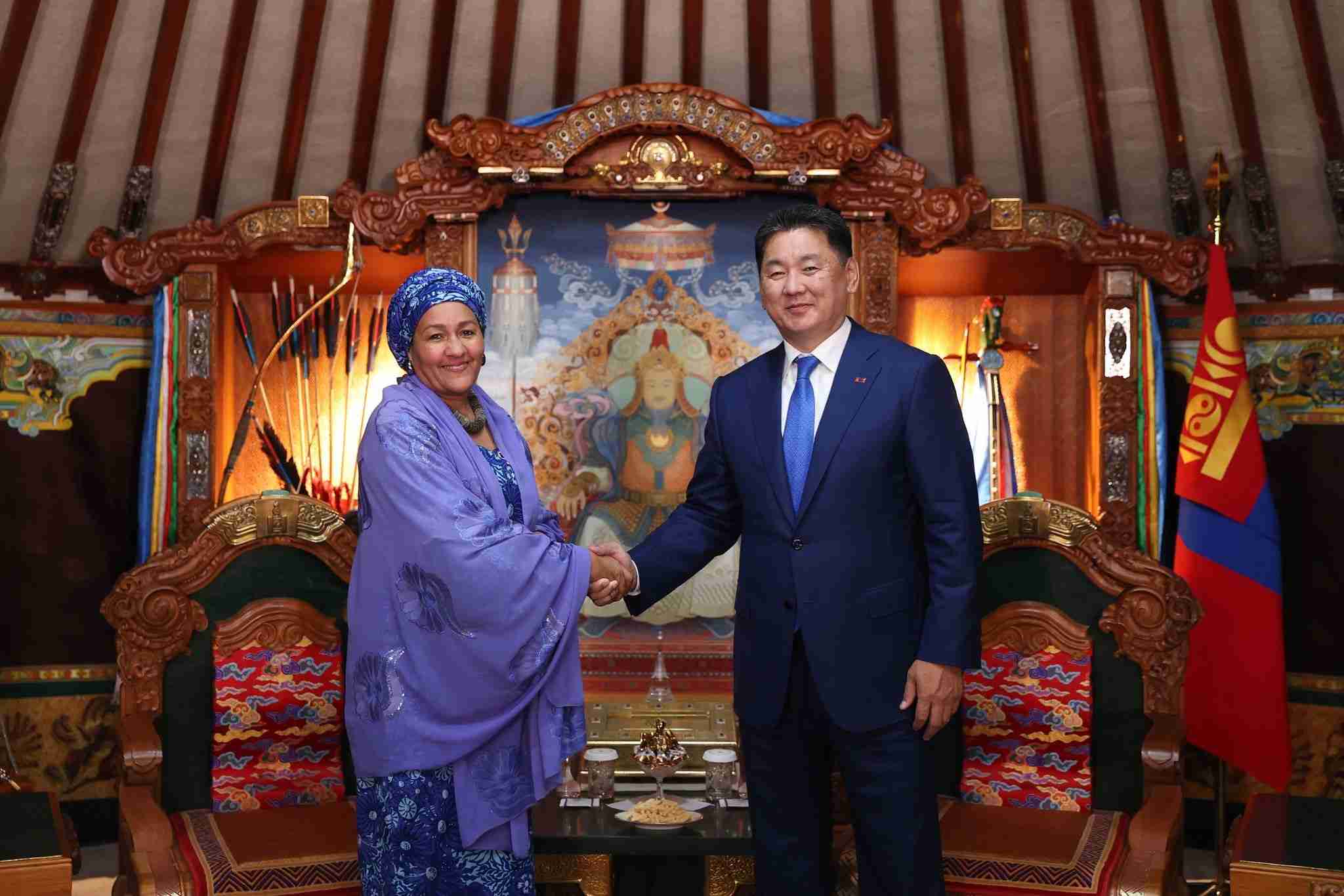 Монгол Улсын Ерөнхийлөгч Ухнаагийн Хүрэлсүх Дэлхийн эмэгтэйчүүдийн чуулга уулзалтад оролцож буй НҮБ-ын Ерөнхий нарийн бичгийн даргын орлогч Амина Мохаммедыг хүлээн авч уулзлаа.