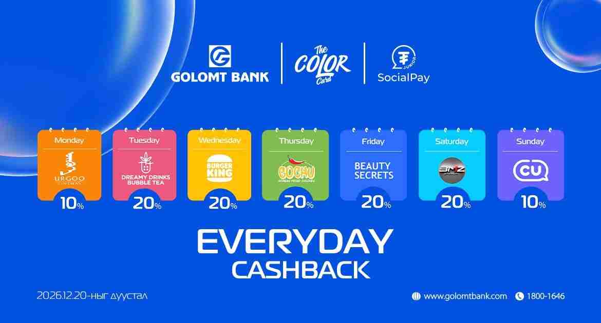 Хүүхэд, залуус аа, санхүүгийн зөв хэрэглээнд суралцахад тань туслах The Color Card, Skate card эсвэл SocialPay Junior аппликэйшнийг хэрэглэдэг үү? Хэрвээ тийм бол Голомт банкнаас хэрэгжүүлж буй “Everyday cashback” урамшуулалт аяны хүрээнд дээрх бүтээгдэхүүн, үйлчилгээг ашиглаад өдөр бүр 20% хүртэлх буцаан олголт авах боломжтой.