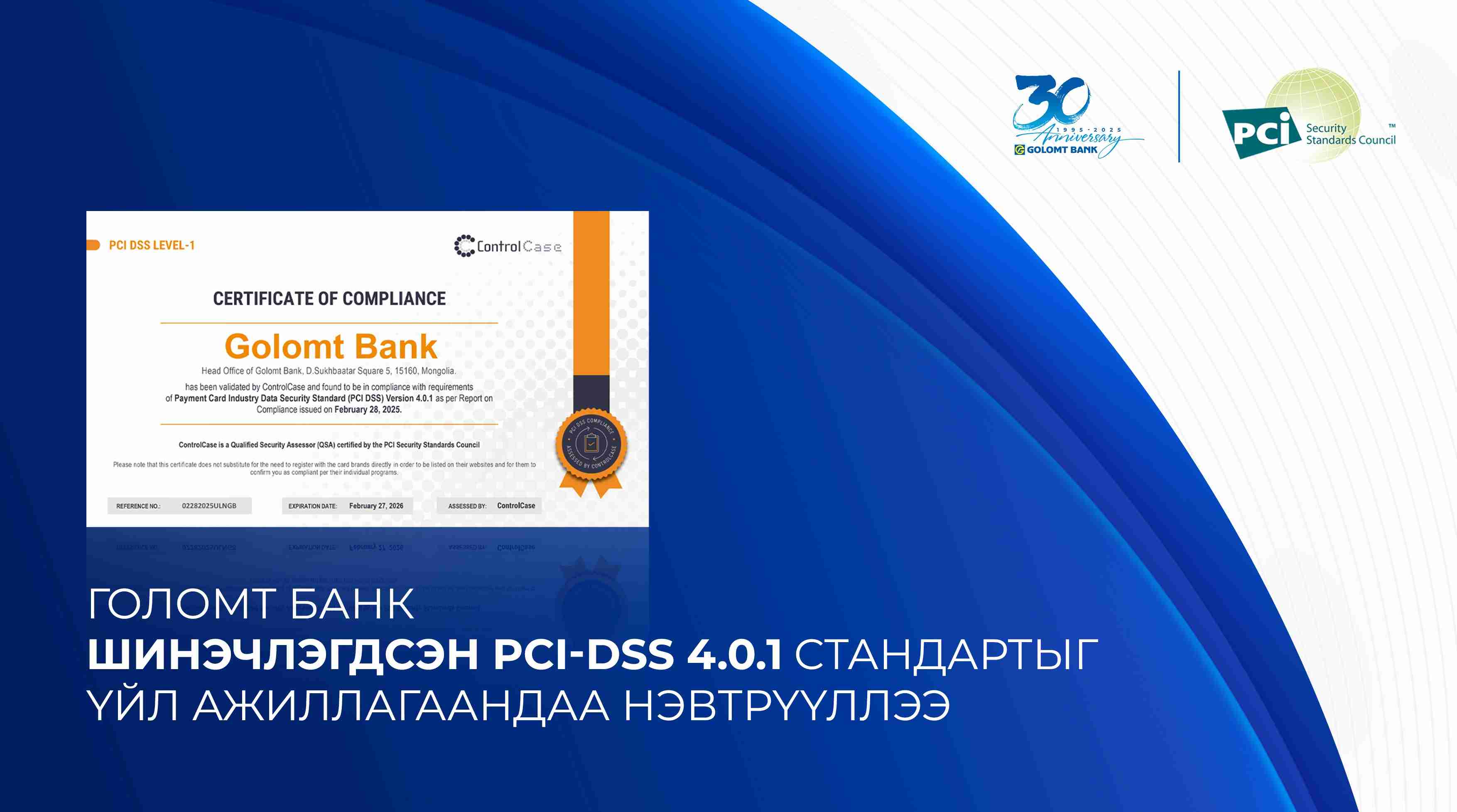 Голомт банк нь PCI SSC Аюулгүй байдлын Стандартын Зөвлөлийн олон улсын картын төлбөр тооцооны аюулгүй байдлын шинэчлэгдсэн PCI-DSS 4.0.1 стандартыг үйл ажиллагаандаа амжилттай нэвтрүүллээ.