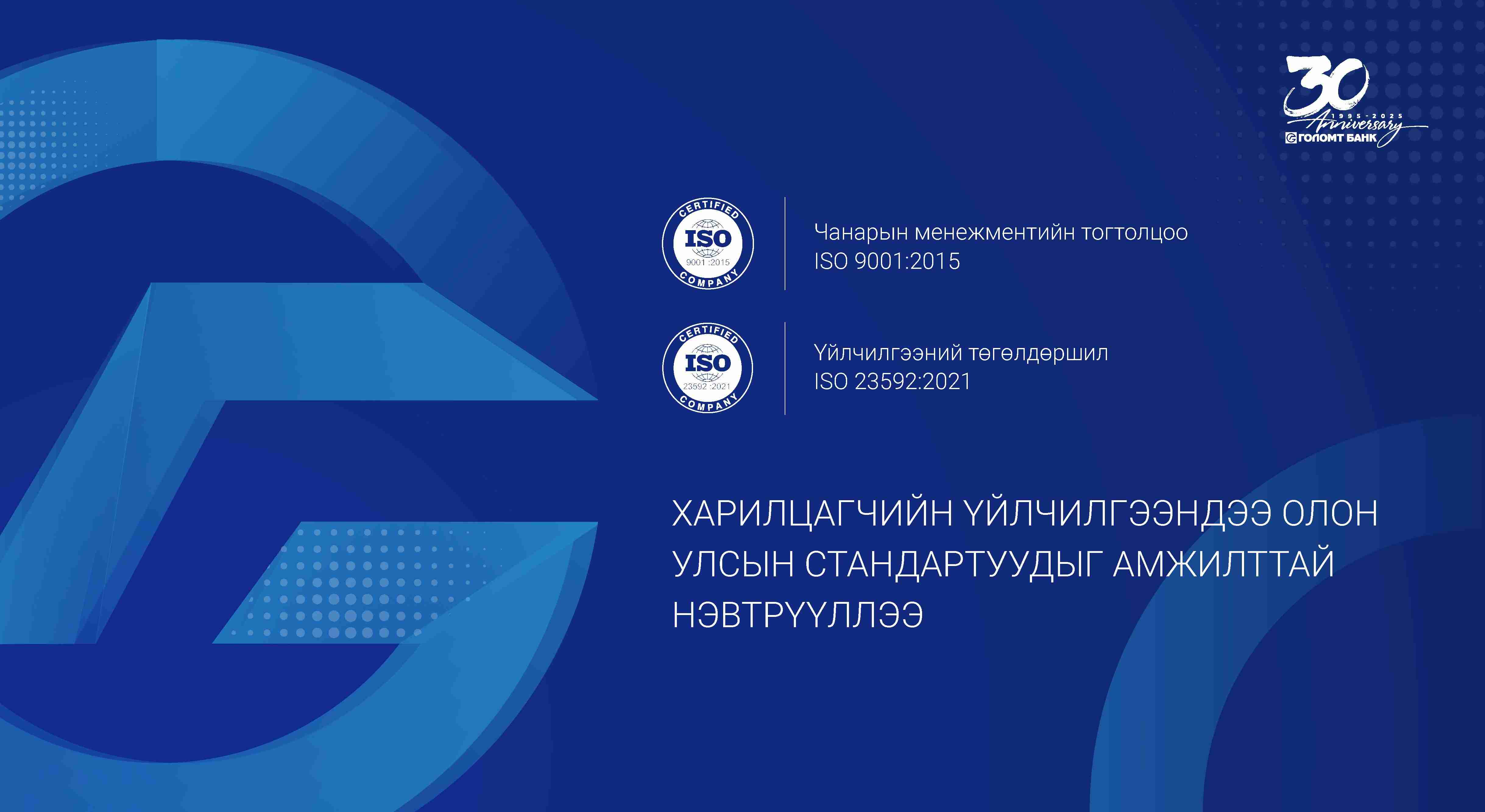 Голомт банк харилцагчийн үйлчилгээндээ ISO 9001:2015, ISO 23592:2021 стандартыг нэвтрүүллээ