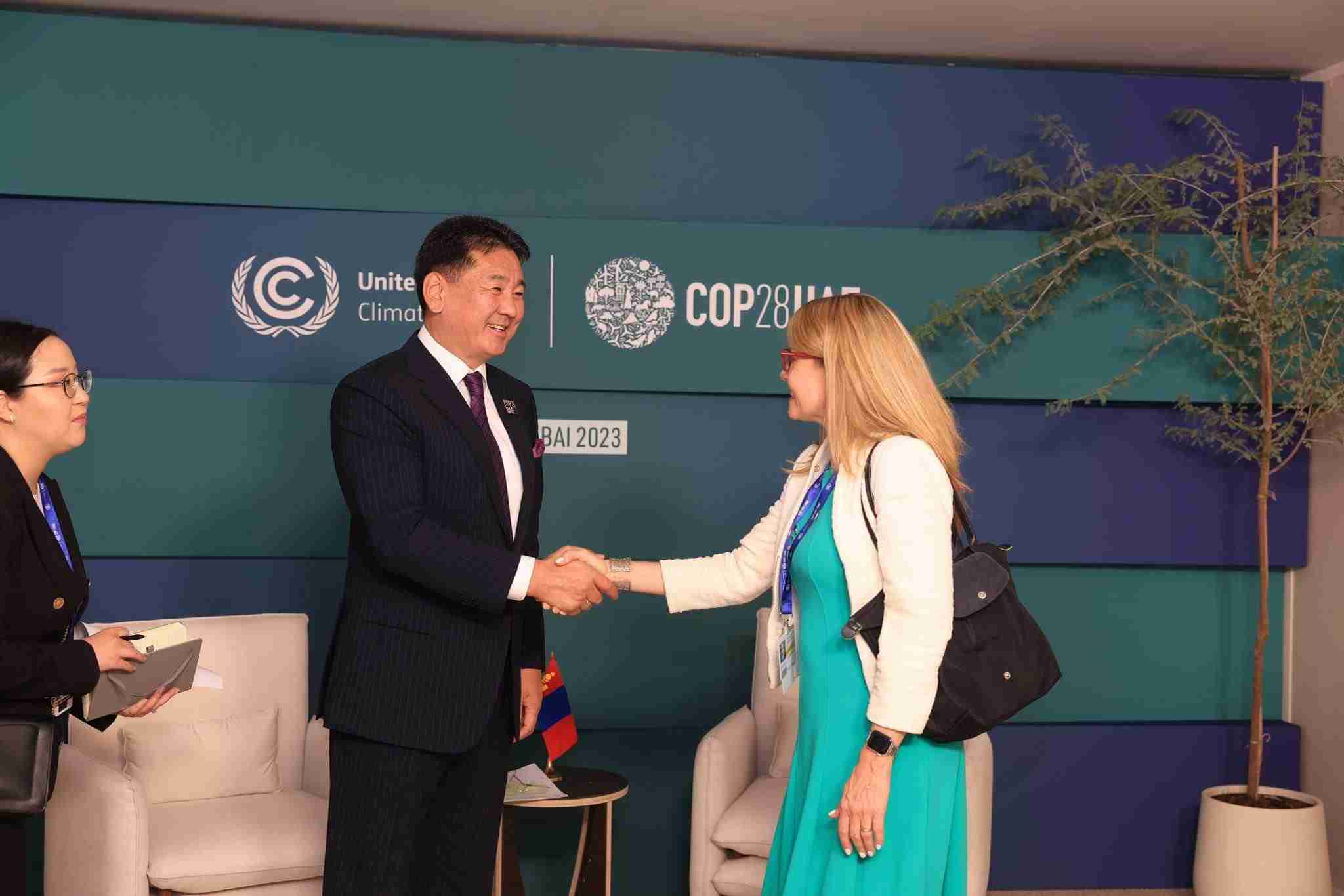 Арабын Нэгдсэн Эмират Улсын Дубай хотноо болж буй Уур амьсгалын өөрчлөлтийн асуудлаарх дээд түвшний уулзалтын үеэр Монгол Улсын Ерөнхийлөгч Ухнаагийн Хүрэлсүх “Дэ Нэйче Консерванси” байгууллагын гүйцэтгэх захирал Женнифер Моррисийг 12 дугаар сарын 02-ны өдөр хүлээн авч уулзав.