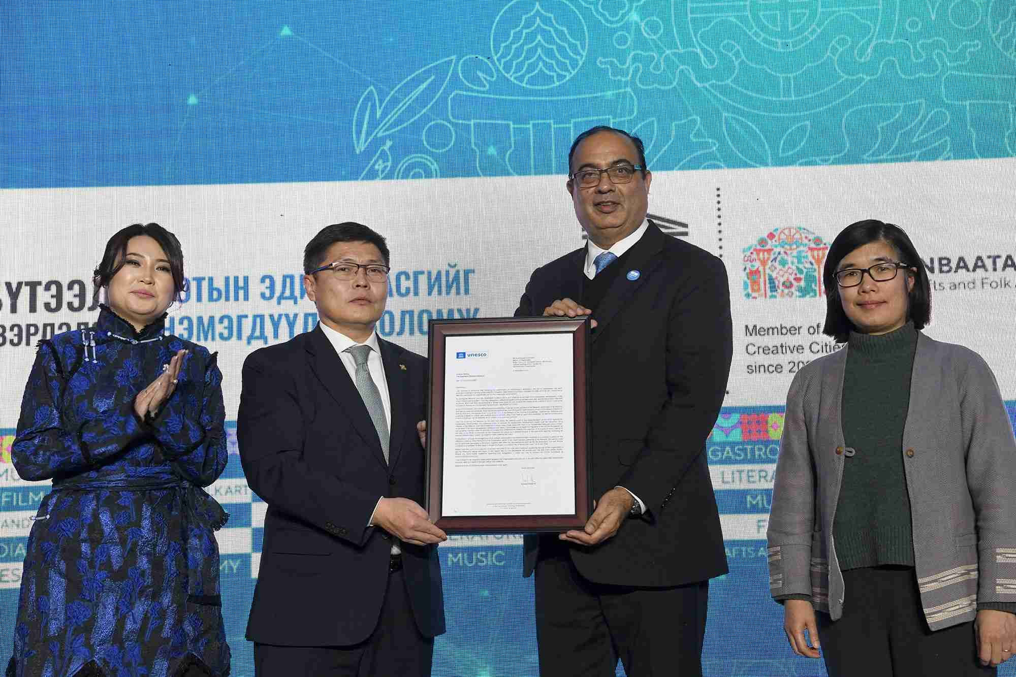 Улаанбаатар хот ЮНЕСКО-ийн “Бүтээлч хотуудын сүлжээ”-нд нэгдсэний батламж гардуулах ёслол өнөөдөр боллоо.